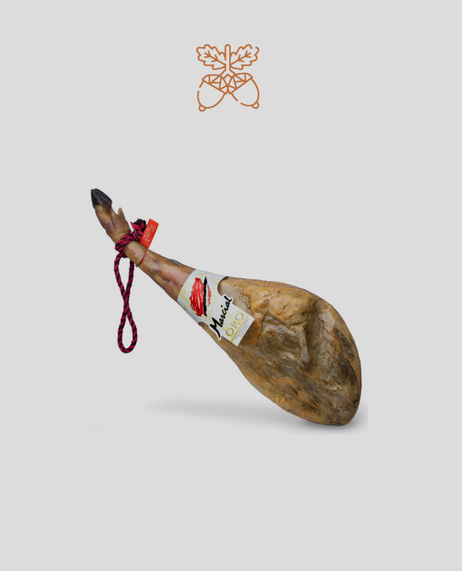 El jamón de bellota con, al menos, un 75% de raza ibérica es la etiqueta roja de Marcial, un pieza selecta, con sabor y aroma únicos. Cerdos alimentados a base de bellota, criados libremente en la dehesa y con una curación de entre 24 y 48 meses que aporta un sabor único.